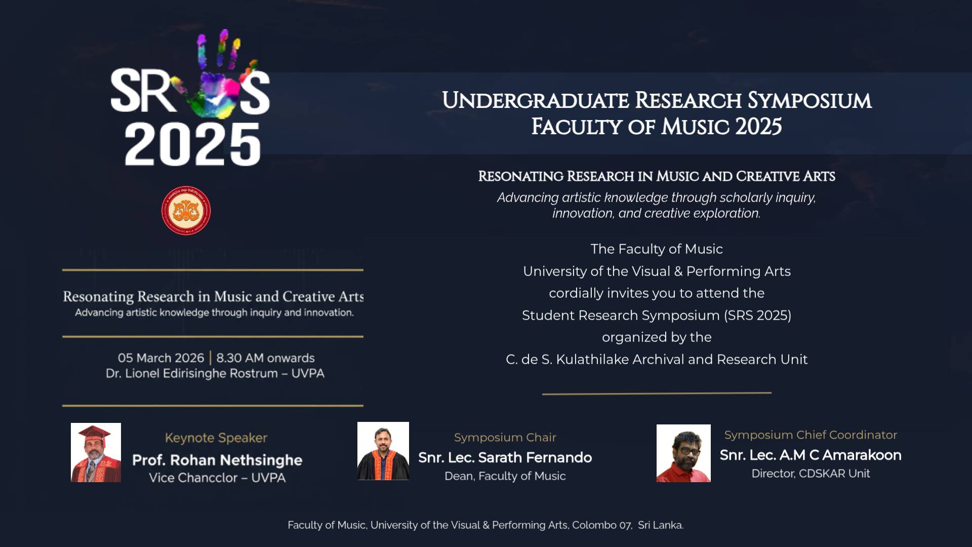 C.D.S. Kulathilaka Archival & Research unit of the Faculty of Music was established in 1990 with main purpose of providing audio & video equipment to facilitate the research conducted by the university and the preservation and continuation of the materials (Audio Visual Archiving) as a cultural heritage, and are vital elements of an institution or a nation’s collective memory, documenting the past, present and future as well as its achievements over the years.