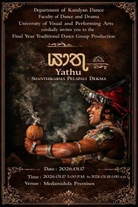 The Department of Kandyan Dance at the University of the Visual and Performing Arts produces graduates who are highly skilled performers, educators, researchers, and cultural ambassadors, committed to preserving and advancing Sri Lanka’s intangible cultural heritage. Through rigorous training, academic research, and interdisciplinary learning, graduates develop technical mastery, scholarly expertise, and innovative creativity, enabling them to make significant contributions to both local and international performing arts industries.