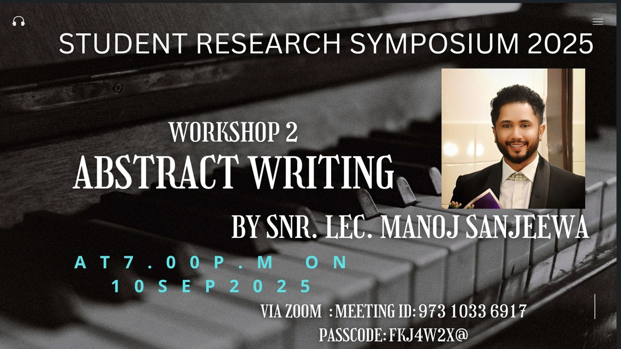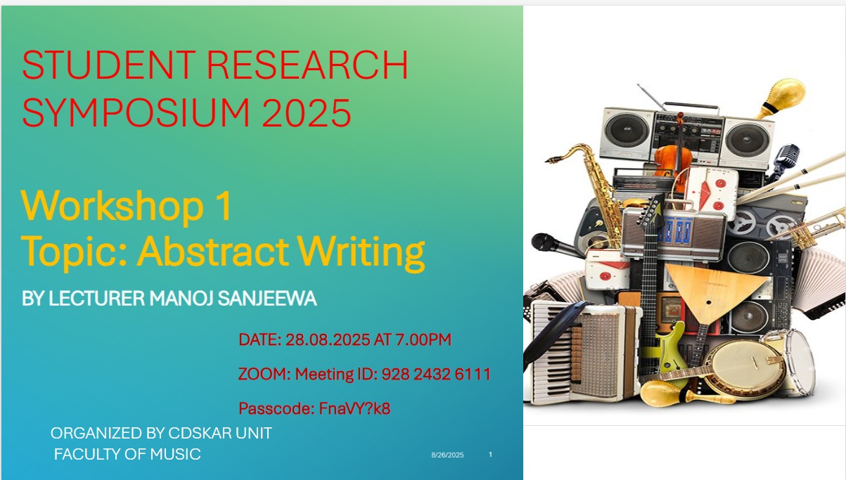 Welcome to the Student Research Symposium (SRS) 2025 of the Faculty of Music, organized by the C.de S Kulathilake Archival and Research Unit will be held on 14th December 2025 will provide an opportunity for students in the University of the Visual and Performing Arts and other Universities in Sri Lanka to present their work in a scholarly setting to the faculty and other representatives of the University.